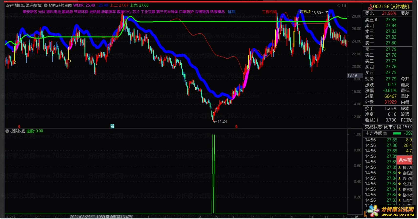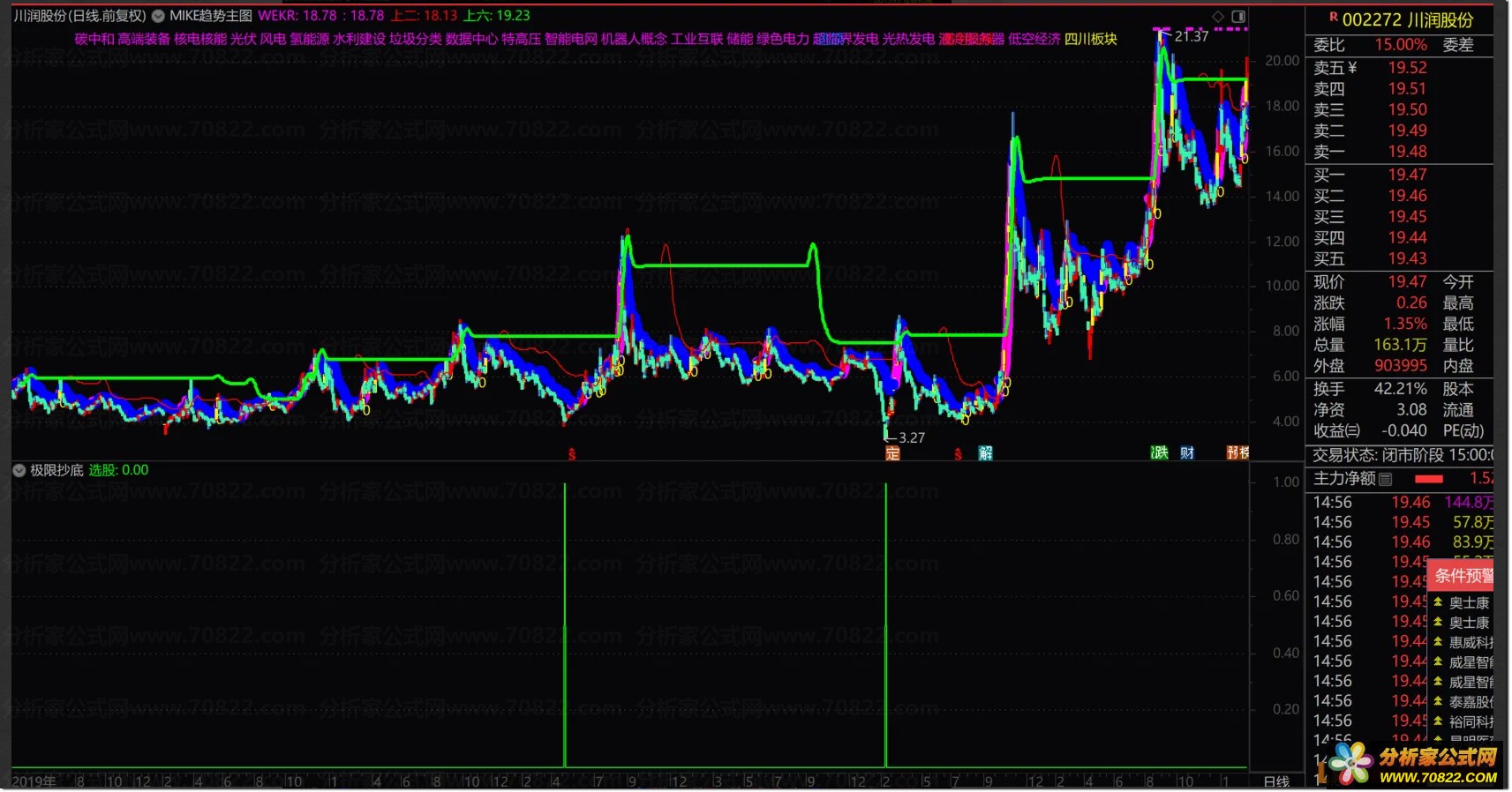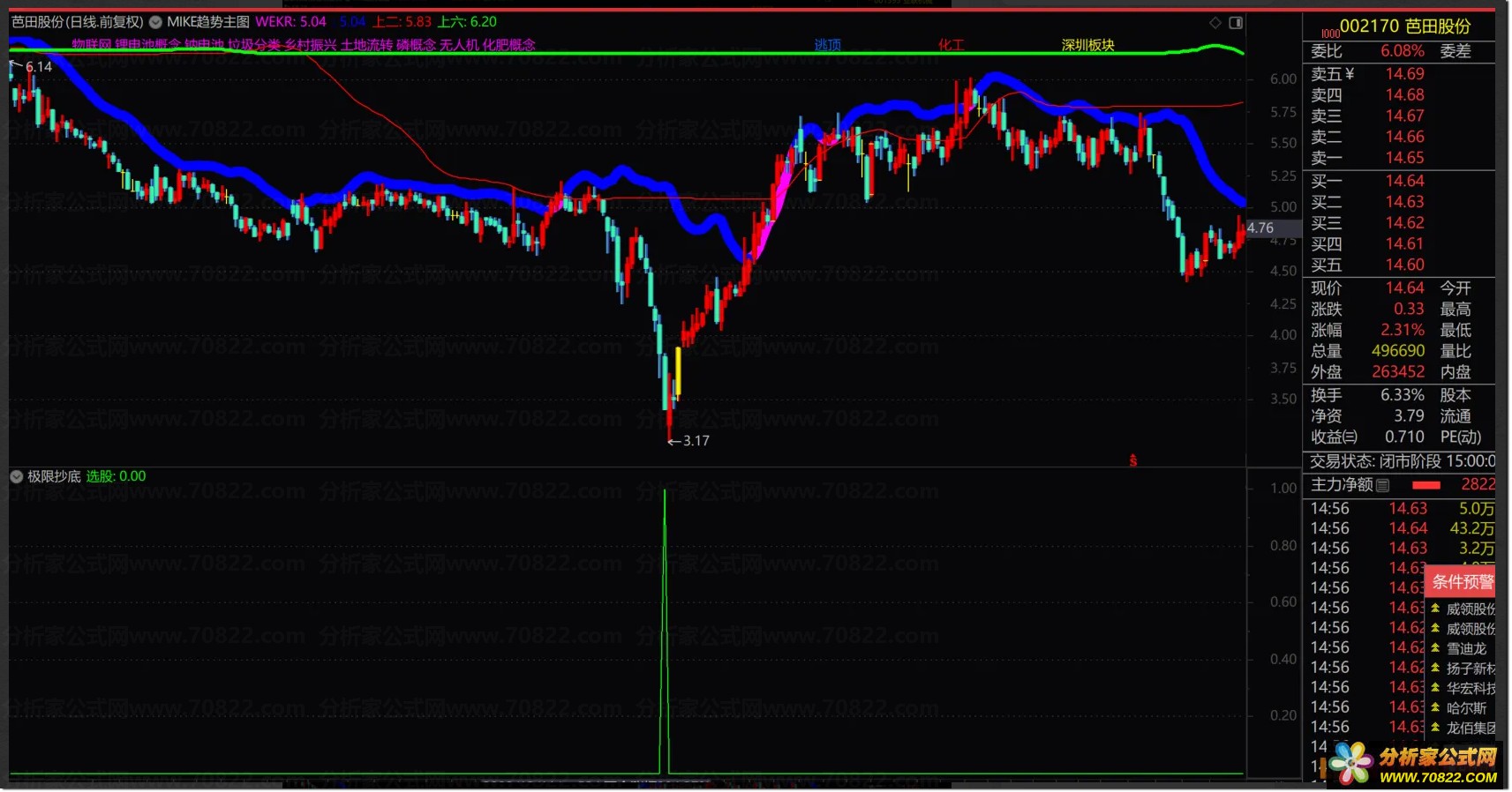 当图表发出明确信号时直接买入即可,这属于典型的超级反弹指标体系。虽然发出的交易信号比较少,但胜在准确率非常高,完美契合不追高不被套的高胜率战法需求,帮助投资者精准捕捉底部行情。