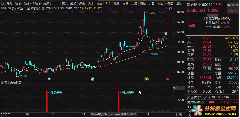 在主图趋势线由粉转蓝或强势线跌破红线的情况下,应及时获利了结;高位出现绿色箭头或成交量减少而股价停滞时,应警惕回调风险。