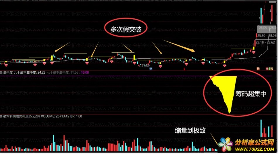 放量突破:必须以一根放量中大阳线,一举突破横盘上沿阻力位及70成本线,无量突破多为诱多;