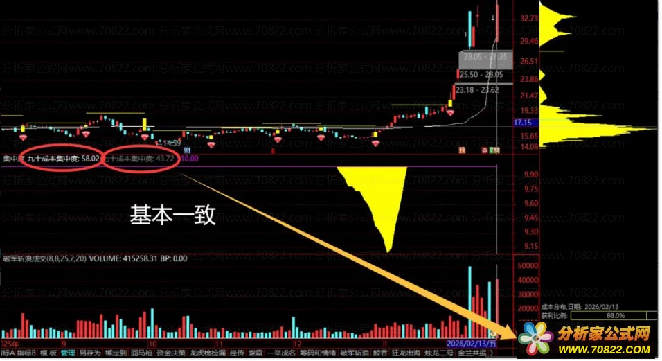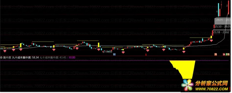 本指标公式重点监测70%与90%筹码集中度:当70%成本区间宽度小于10时,标记黄色带;90%成本区间宽度小于10时,标记紫色带。数值越小,代表筹码越集中。
