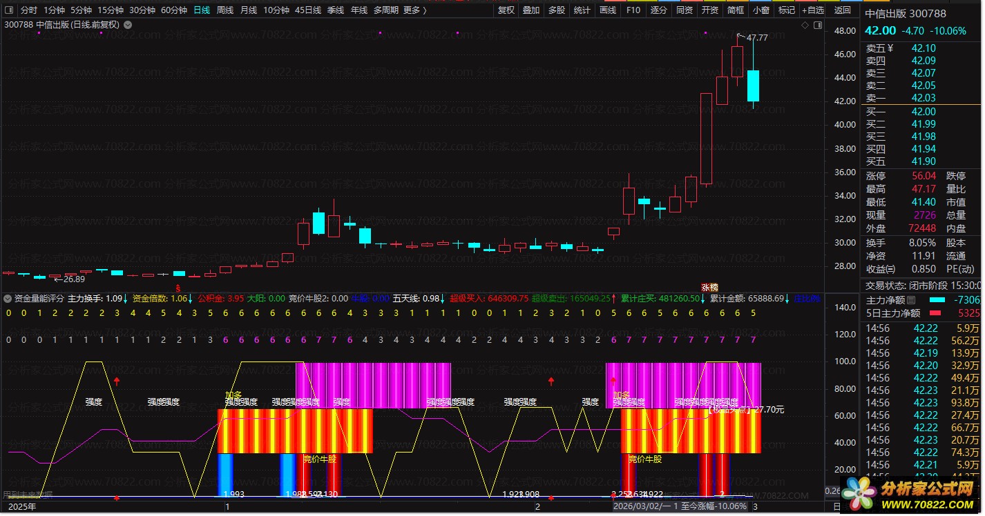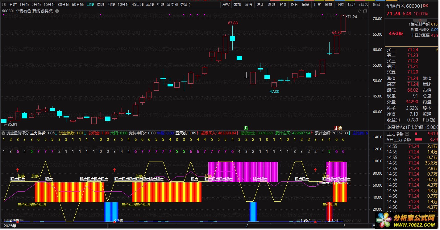 〖资金量能评分〗副图指标,量化选股利器 助散户从新手跟风迈向专业分析 本通达信股票指标公式以量能极值、价格突破、多指标共振与主力资金流测算为核心,通过全维度数据整合与量化评分机制,精准筛选高胜率牛股信号,是实战中高效的量化选股指标;