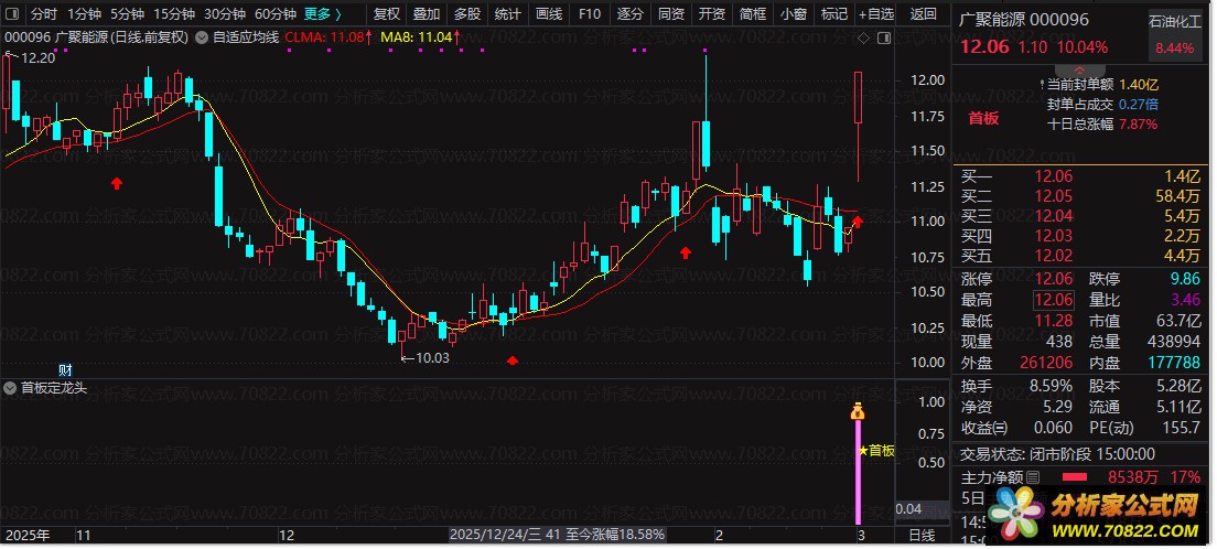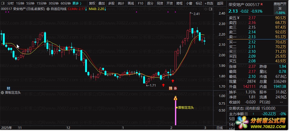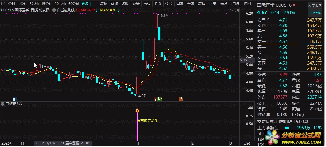 使用“首板定龙头”非常简单。首先,在通达信软件中导入此公式作为副图指标。然后观察图表上出现的紫色线条(由STICKLINE函数绘制),当满足所有设定条件时,即会显示特殊的图标和文字提示“★首板定龙头”,这表明当前股票具有成为龙头股的潜力。