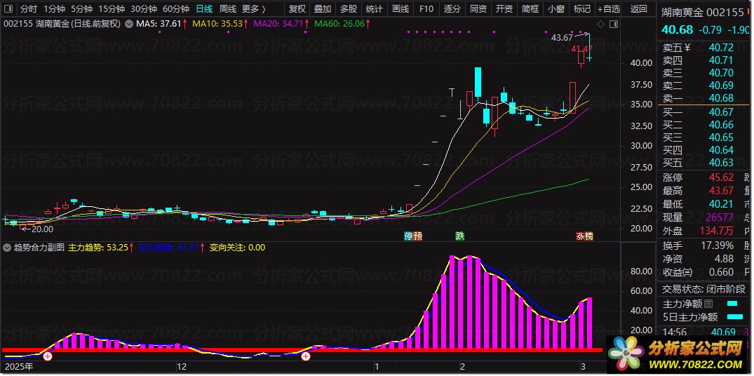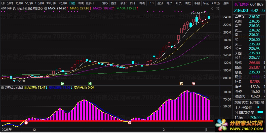 “趋势合力”是一款融合多重周期均线与动量算法的强力指标。副图通过黄蓝双线直观展示“主力趋势”与“空头趋势”的博弈状态,底部红绿柱体标识多空安全区。核心亮点在于独特的“变向关注”信号,能敏锐捕捉主力由空转多的临界点。选股公式则提炼了副图精华,专门筛选主力趋势金叉且动能爆发的瞬间,旨在过滤震荡,锁定主升浪起点。
