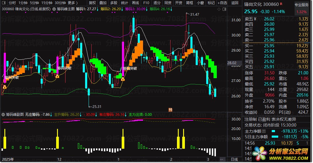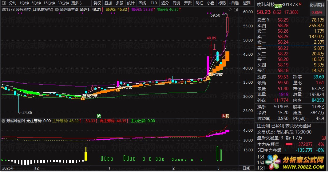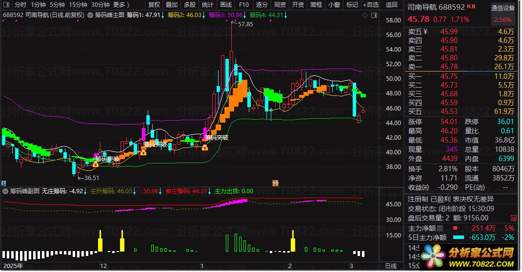 主图通过四条动态筹码线(筹码1-4)构建价格波动通道,结合MACD与角度斜率(ACB)判断趋势强度,当出现“筹码突破”信号时,往往预示主升浪启动。