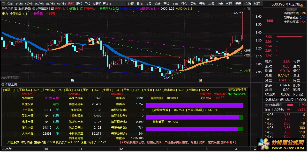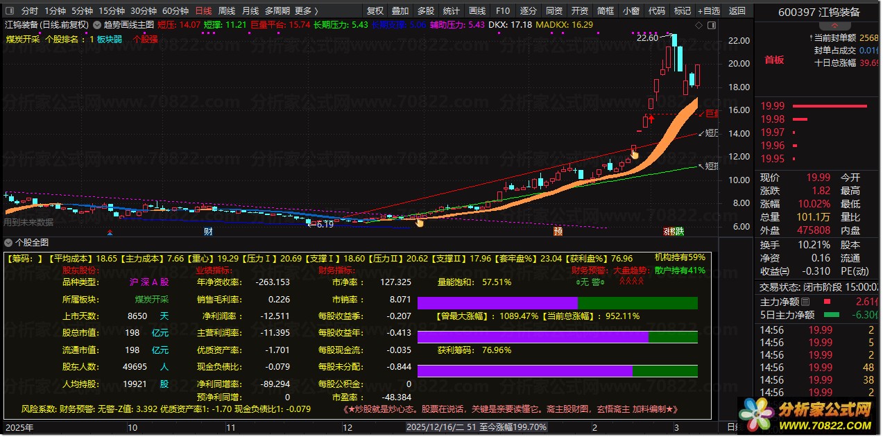 “个股全图”是一款功能强大的通达信副图指标,专为深度基本面分析打造。它创新性地将F10关键数据可视化,涵盖股东结构、业绩指标(如净资产收益率、销售毛利率)、财务估值(市盈率、市净率)及Altman Z值财务预警模型。公式通过直观的文字面板和动态进度条,实时展示量能饱和度、获利筹码比例及大盘趋势,帮助投资者快速识别主力动向与潜在风险,是践行价值投资与量化选股策略的必备工具。