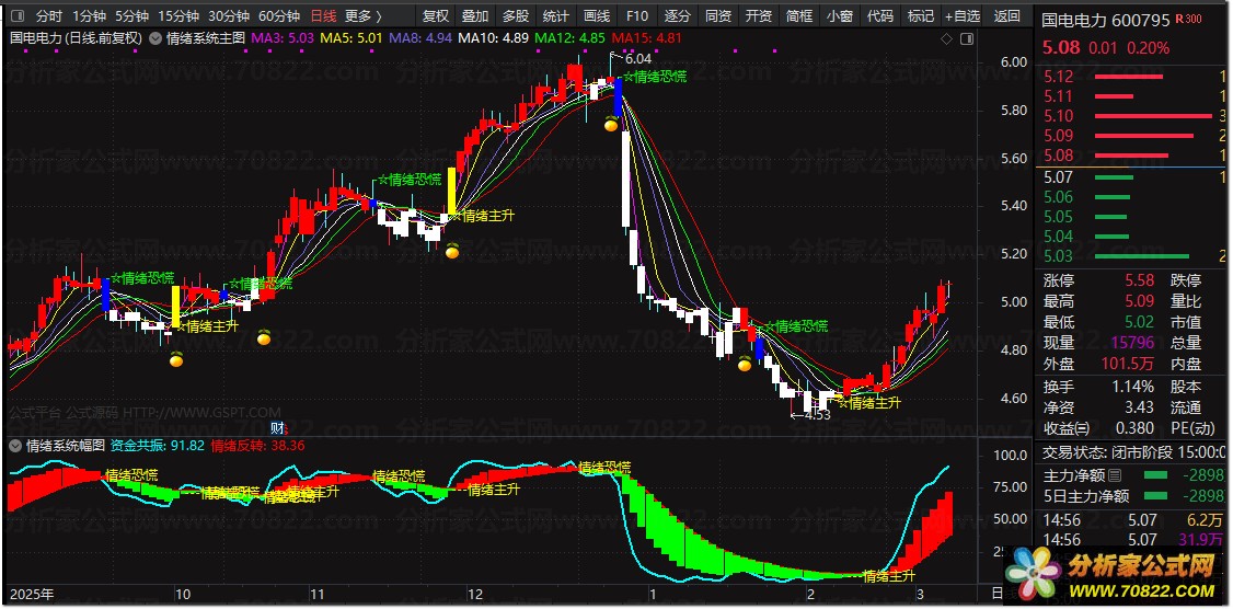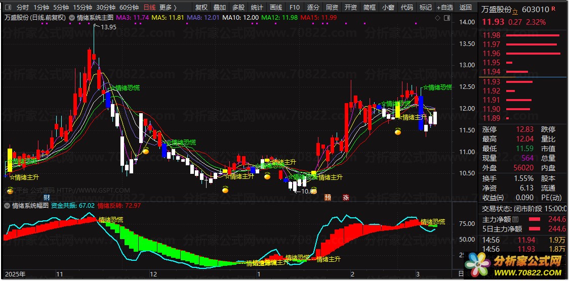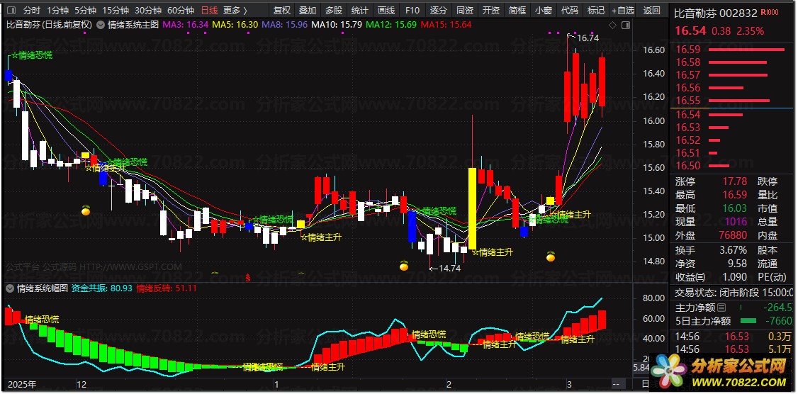 3. 主幅图情绪恐慌共振代表即将反转上升,这是股票底部反转的重要信号,投资者可关注此共振点。