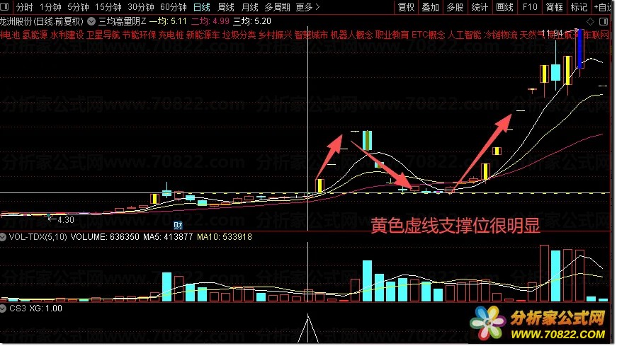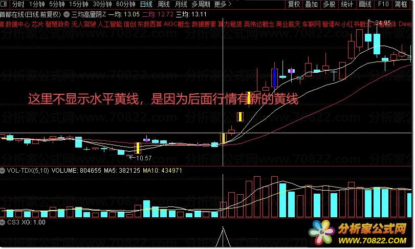 本套股票指标包含一个主图指标和一个选股指标。主图指标直观展示上述分析效果,其中三条曲线为加权均线,黄色小实体标记涨停板,黄色水平线则标示高量阴实体的中间位置。系统默认只显示最近一次的30日高量阴,因此主图上仅呈现近期的一条黄色水平虚线。该主图指标对于日常看盘具有重要参考意义,这条水平黄线可以作为关键的支撑线或压力线使用,帮助投资者判断买卖点位。
