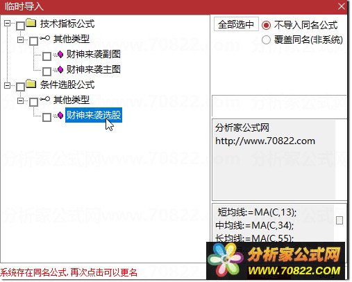 * 关于股票公式时间限制,如果在引入大智慧公式,交易师公式或者飞狐公式的时候,发现公式名称栏是空白的,这时候调整电脑时间到1997年,又能出现公式名称,并且能正常显示,可能是公式使用期限已过。