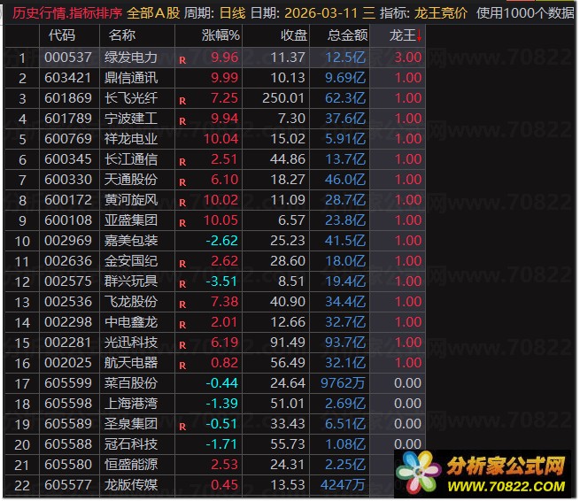 〖龙王竞价〗集合竞价排序指标。 早盘竞价选股指标,融合个股与大盘对比、量能、资金、均线、涨停特征,识别多重信号共振的强势机会。 9:25-9:30进行排序,龙王值排序看前三。