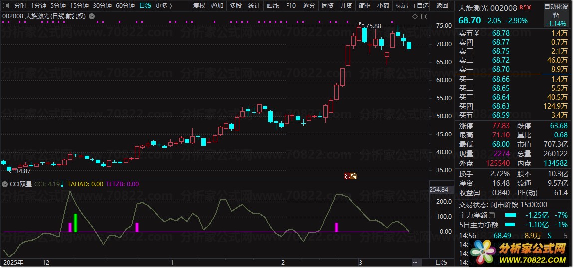 〖CCI双星〗捕捉量能爆发与趋势反转的绝佳利器 “CCI双星”是一款专为通达信用户打造的股票趋势反转指标公式,巧妙融合了经典CCI顺势指标与成交量均线金叉信号。该公式通过双重过滤机制,精准识别主力异动:当5日均量线上穿20日均量线时,副图底部弹出紫色柱状“量星”,提示资金进场;而当CCI从200上方高位回落并确认拐头向下时,绿色“顶背离星”随即出现,警示短线见顶风险。