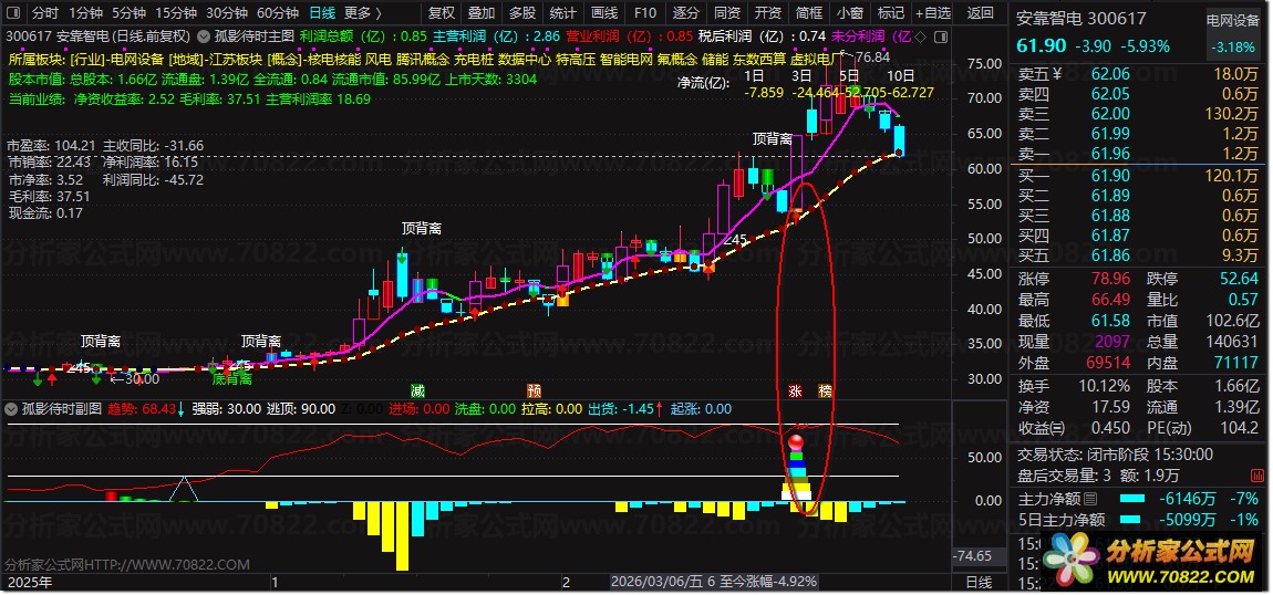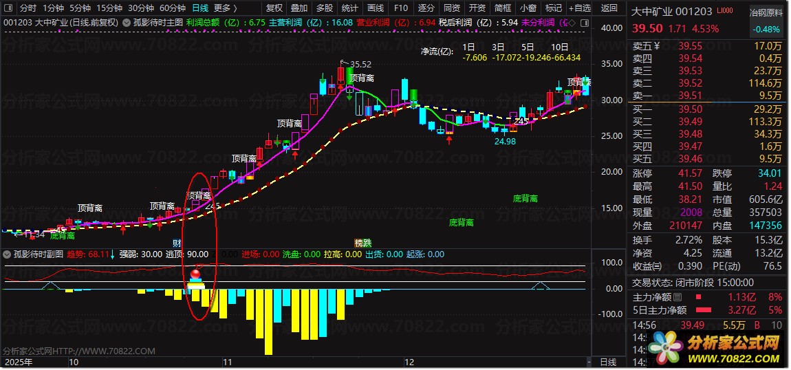 卖出策略:副图出现黄色“拉高”转青色“出货”柱,或主图提示“顶背离”时,应警惕回调风险,及时止盈。