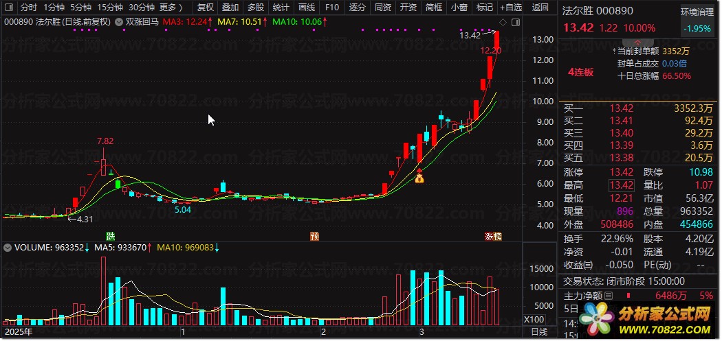 〖双涨回马主图〗捕捉涨停回调后的黄金买点 “双涨回马主图”是一款专为短线爆发力设计的通达信主图指标公式。它巧妙融合了EMA趋势线与多周期均线系统,核心在于识别“一阳穿三线”的强势启动信号,并精准定位连续涨停后缩量回调的“回马枪”买点。