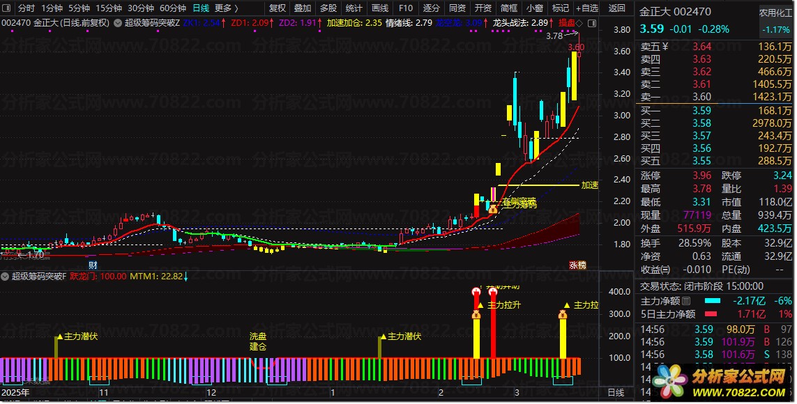 主图用于观察价格与筹码支撑/压力关系,黄色K线标识突破有效;