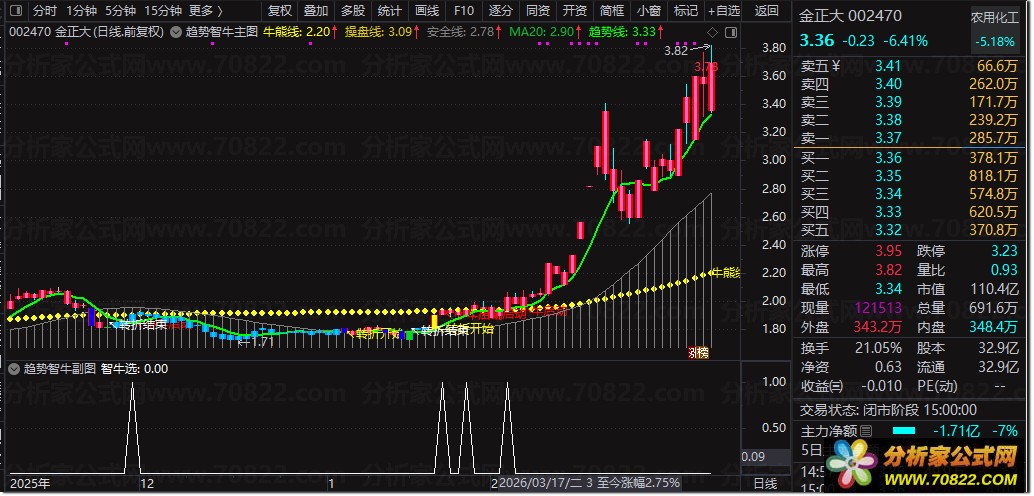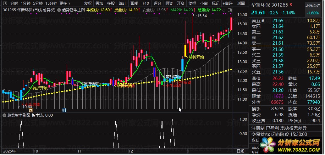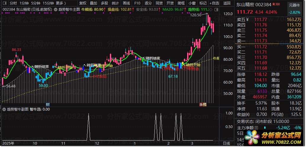 〖趋势智牛〗精准捕捉牛熊转折,主图+副图+选股一体化指标公式 “趋势智牛”是一套融合量价关系与均线系统的通达信股票指标公式,专为捕捉主力启动信号设计。主图通过“牛熊线”动态识别多空分界,结合“操盘线”与“安全线”构建三重过滤机制,当股价上穿牛熊线时提示“小牛启动”,趋势线与20日均线金叉则标记“转折开始”,直观呈现波段买卖点。副图简化核心逻辑,聚焦“智牛选”信号,辅助确认主图趋势。选股公式直接提取“股价上穿牛熊线”瞬间,适合盘中快速筛选潜力股。