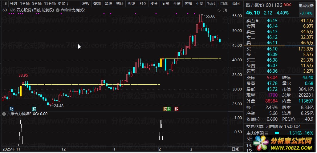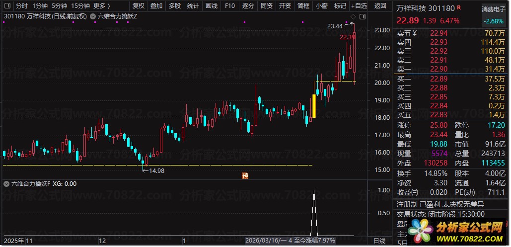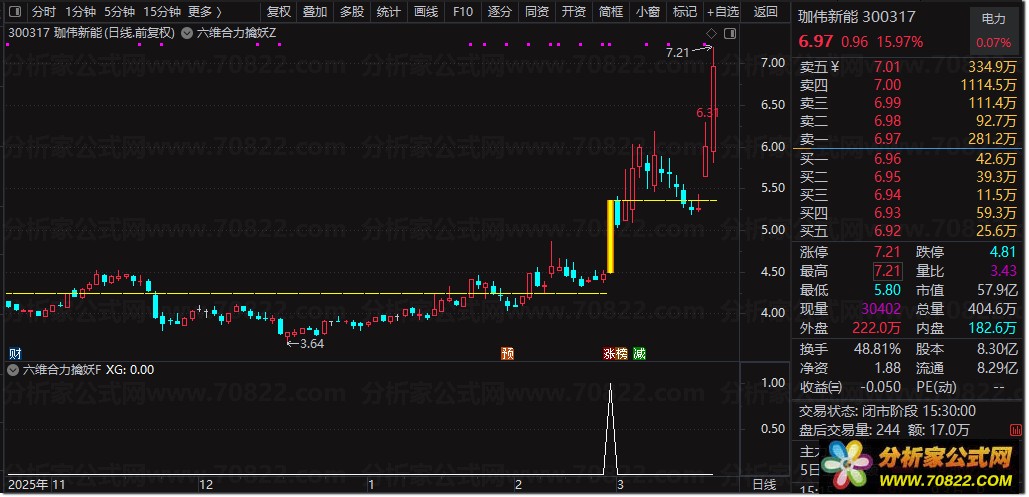 该指标是一套综合性的股票技术分析工具,其核心设计逻辑是融合六大经典技术指标和量能条件,形成六维共振选股模型,旨在筛选出可能即将启动的强势股。指标由趋势、动能、资金三个维度构成,具体用法如下: