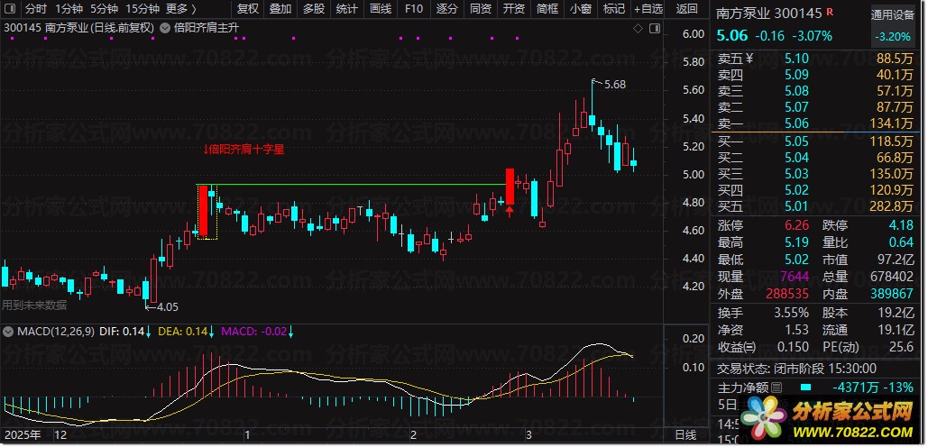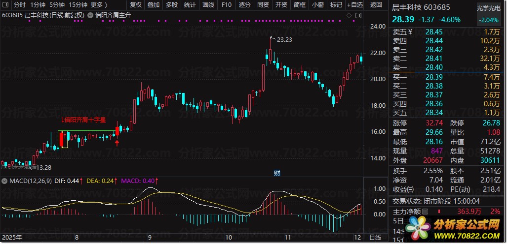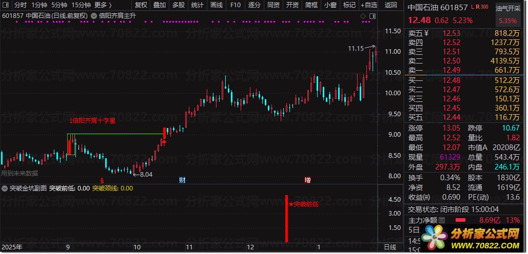 信号识别:当K线出现黄色柱体并标注“↓倍阳齐肩十字星”时,表示主力完成洗盘,进入潜伏区。