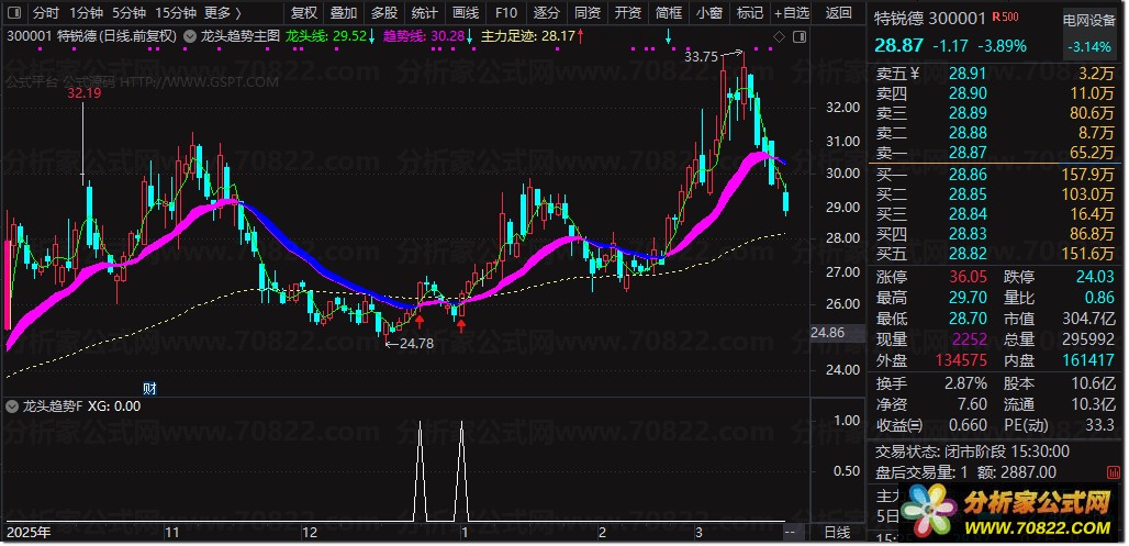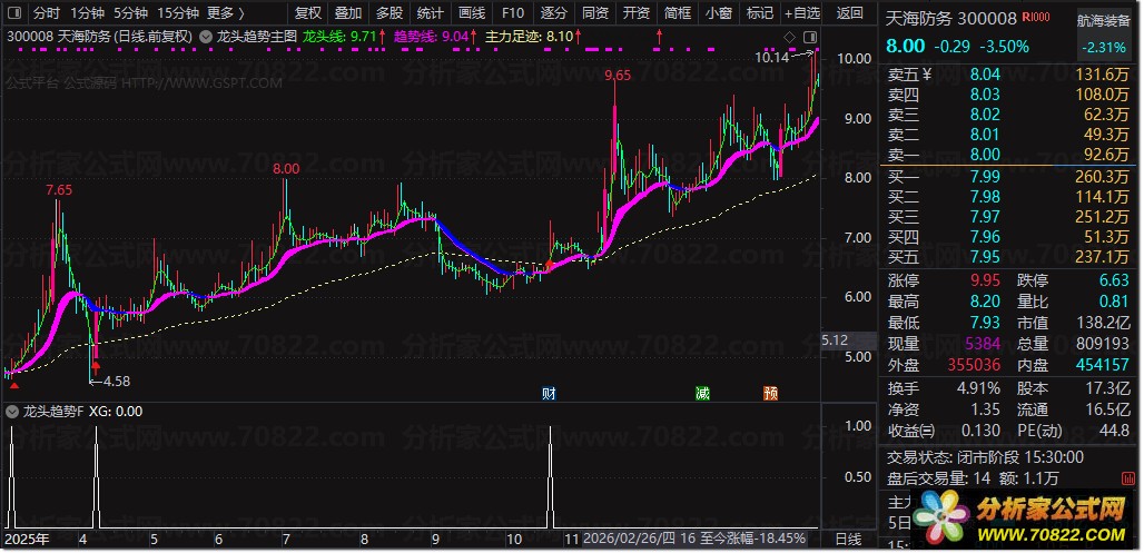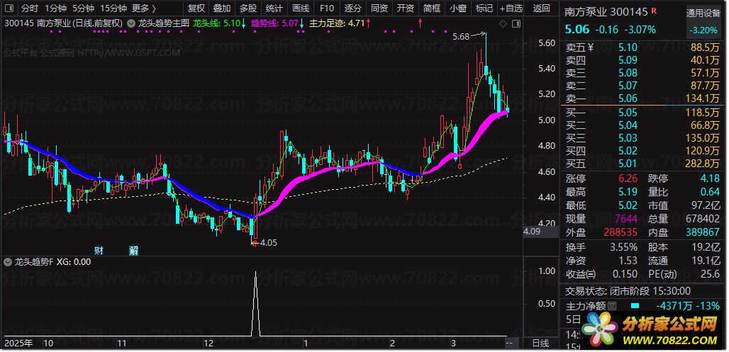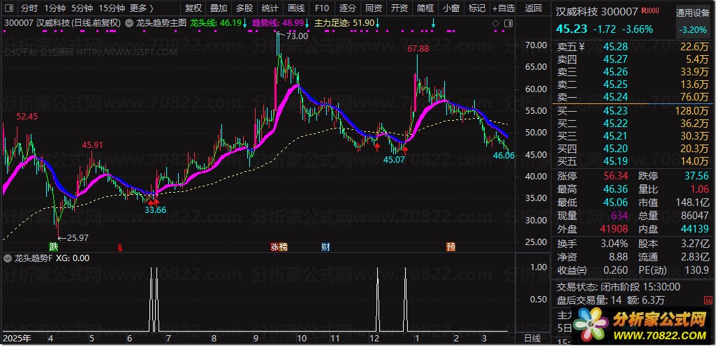 2、在主图显示中,当紫色趋势线发生拐头向上的转向,且逐步演变为粗壮的紫色带状时,意味着个股正式步入上升趋势。在此阶段,只要紫色带未转变为蓝色,亦或是股价未跌破趋势线,投资者便可持续坚定持有,静待股价上行,这是趋势跟踪策略的关键所在。