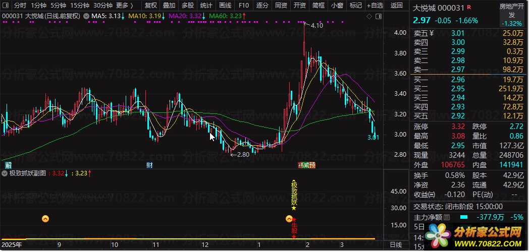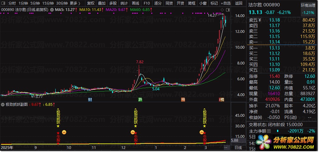 〖极致抓妖〗副图/选股指标,精准捕捉主升浪启动点 无未来 今日,要向大家介绍一款名为“极致抓妖”的副图指标,该指标还配套有选股功能。近期,听闻业内大咖展大侠有一番见解颇为深刻:“主力若要误导散户,在成交量上动手脚相对容易,可价格却难以造假。毕竟,操纵价格所需付出的成本与难度,远非操纵成交量可比。成交量能通过对敲手段人为制造,付出的不过是些交易费用;但价格若要虚假拉升,绝非易事。”细细想来,这番话的确颇具道理。既然如此,该如何精准捕捉主升浪呢?关键就在于价格。然而,仅凭K线图来研判,往往难以洞察真相。股价每日起起伏伏,恰似反复冒头的青春痘,让人满心困惑、无从下手。而今天分享的这款指标,便能从价格维度,为你拨开主升浪的迷雾。值得一提的是,该指标不存在未来函数,大家可安心运用。接下来,为大家详细讲解该指标的使用方法: