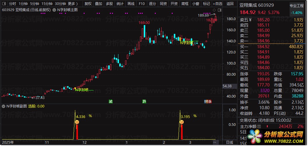 主图通过计算5、13、20、60日均线的角度加权合成“AA5”,用于判断趋势强弱。当股价在短期内出现涨停(AA6)、随后回调不破涨停起点(AA9),并在3日内放量反包(AA11)时,自动在K线最低点标注“N字封喉”字样,并绘制绿色支撑线。黄色K线即为信号触发位置,直观展示 强势股回踩确认 的买点。