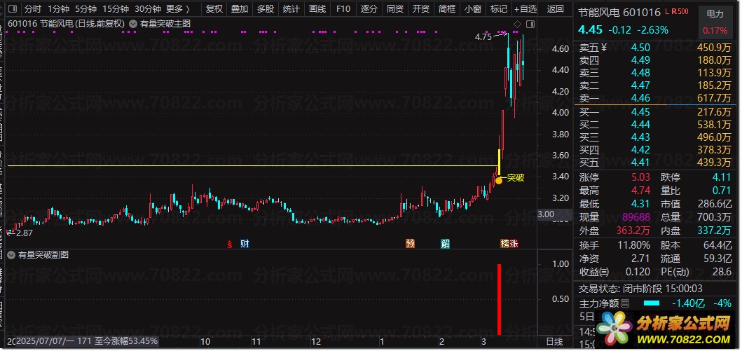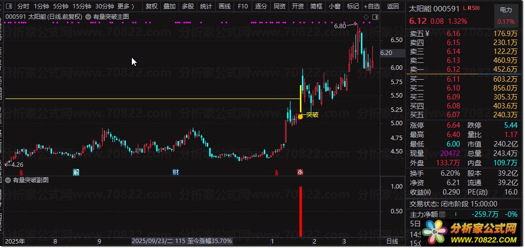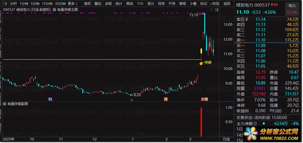 核心逻辑为:先定位一根创70日新高、实体跌幅超4%、且开盘跳空向下的“有量长阴”,将其视为主力洗盘高点;随后当股价放量突破该高点时,发出买入信号。整套指标包含主图(标注突破位置)、副图(柱状信号)、选股(自动筛选),适用于捕捉强势股第二波启动。