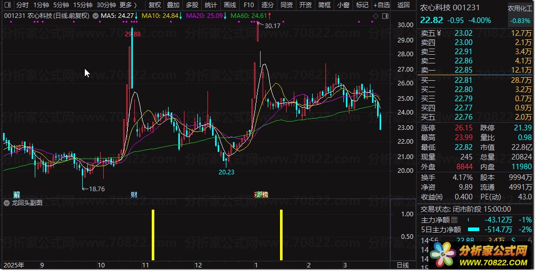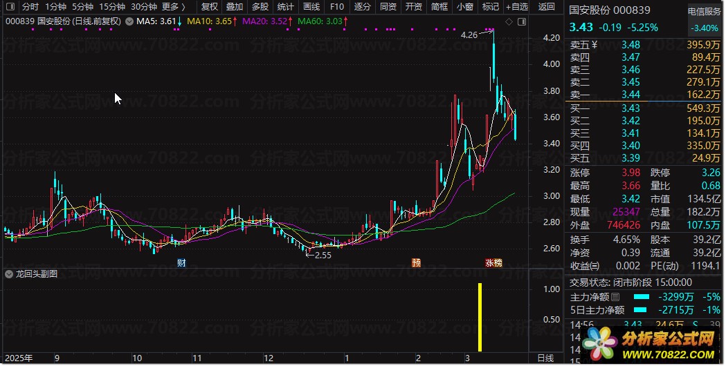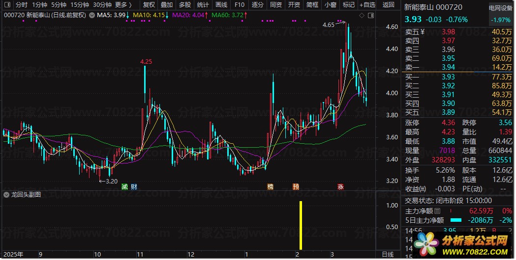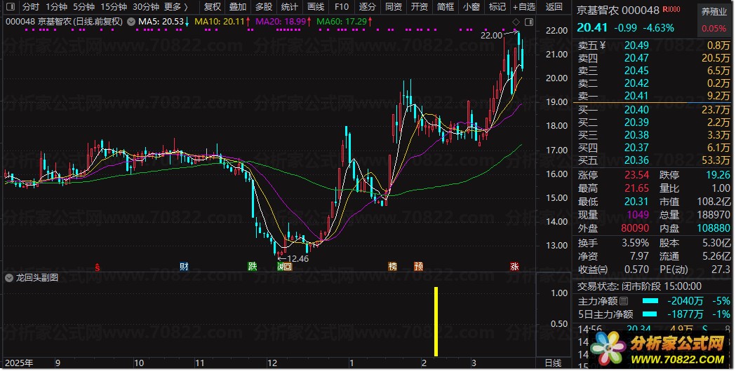 〖龙回头〗缩量回踩企稳:捕捉强势股二次起爆的选股秘籍 龙回头缩量回踩企稳套装指标 “龙回头缩量回踩企稳套装指标”是一套专为捕捉强势股回调后二次启动设计的通达信股票指标公式。该组合包含副图预警与选股公式,核心逻辑基于“龙回头”战法,精准识别前期涨停强势股在缩量回踩重要均线(如5日、20日线)后的企稳信号。