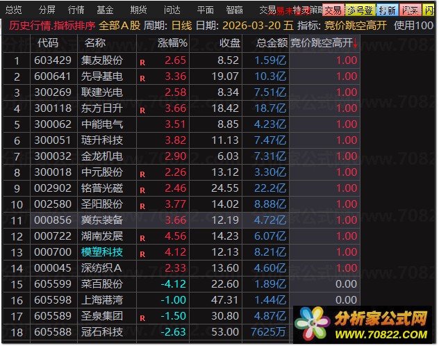 〖竞价跳空高开〗优化版,不追高 筛选竞价阶段跳空高开的成长性比较好的个股 指标简介:
