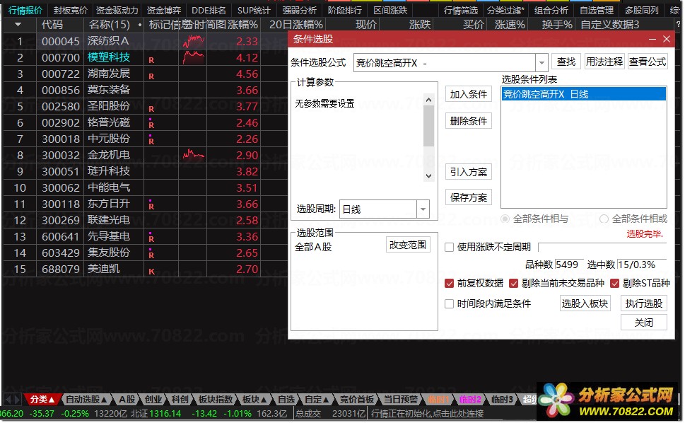 核心改进:新增 "开盘价 > 昨日收盘价" 的跳空确认、量比上限(5 倍),并扩大风险股剔除范围,解决原公式逻辑漏洞;