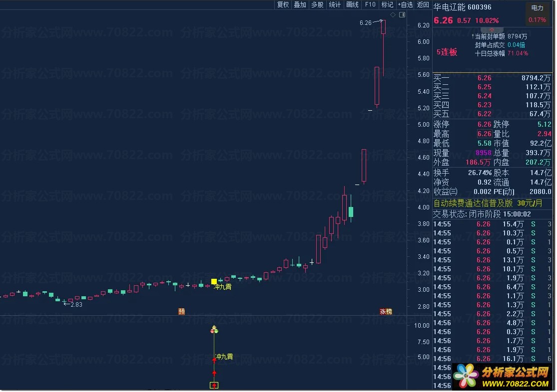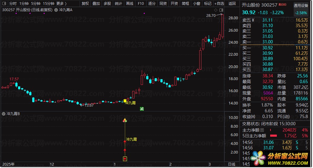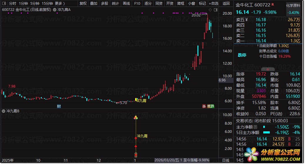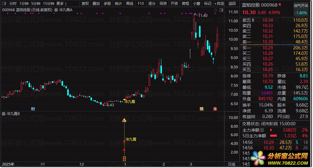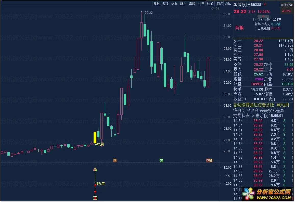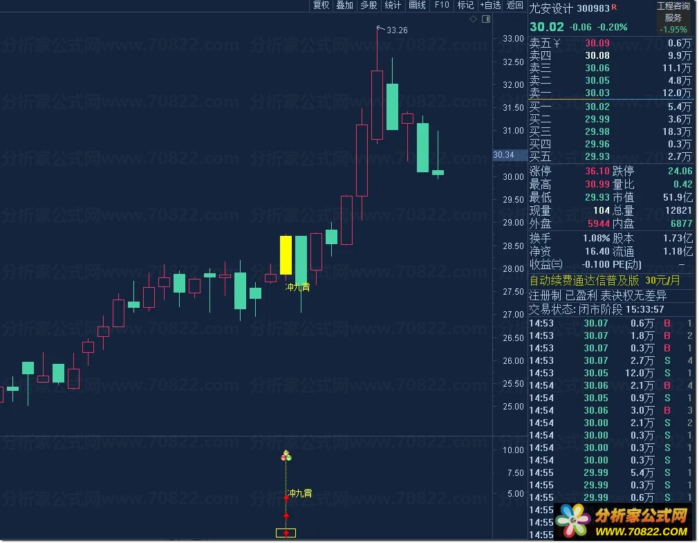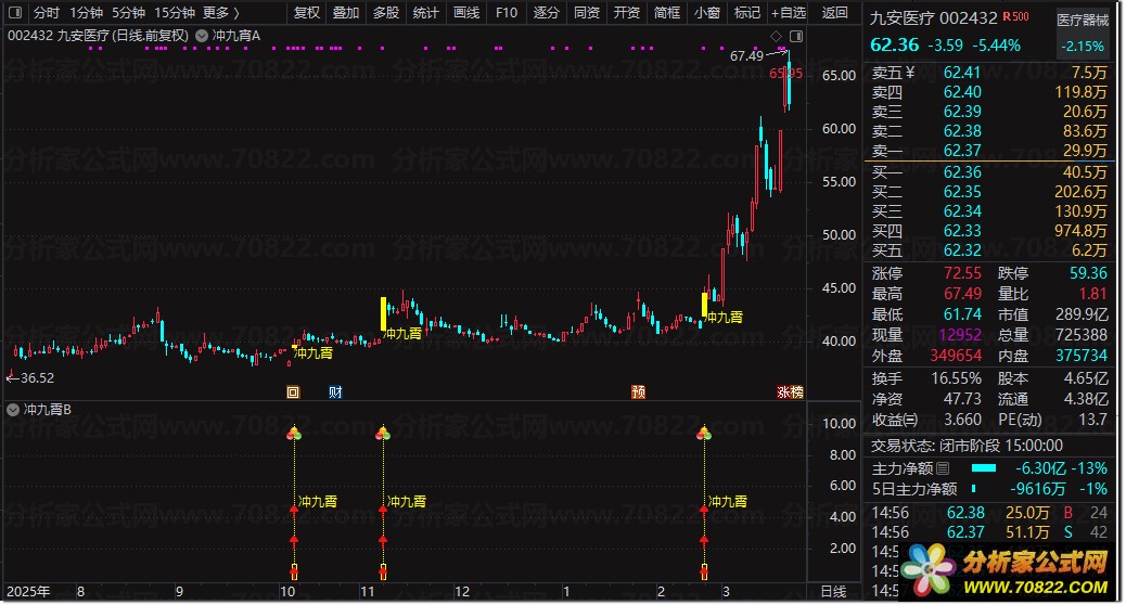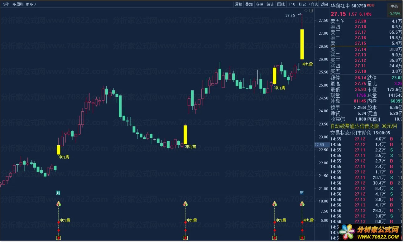 当主图出现黄色柱体并标注“冲九霄”字样,或副图亮起黄色信号柱及图标时,即为潜在买点;可直接运行选股公式快速筛选当日符合“低位缩量突破”形态的个股。该通达信自定义指标特别适合短线交易者捕捉涨停板前夕的起爆行情,助您在股市中一飞冲天。