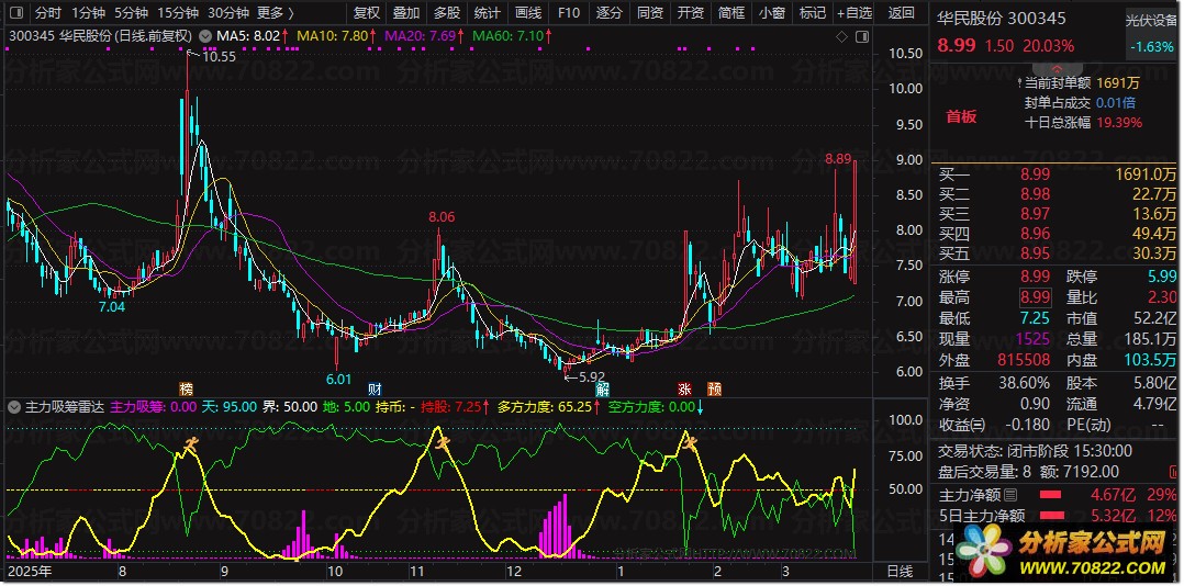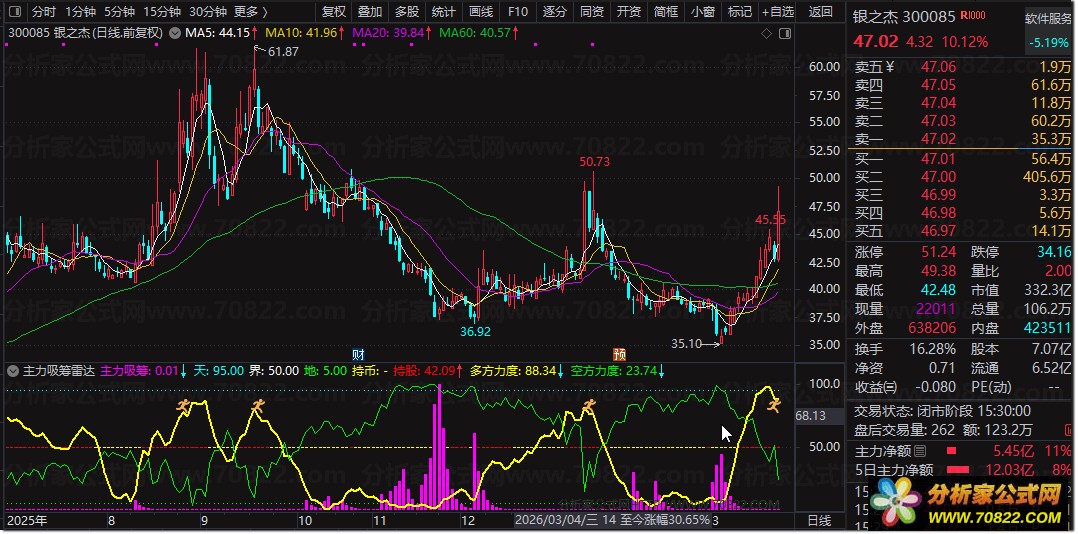 〖主力吸筹雷达〗副图指标,精准捕捉底部起爆点 本公式融合通达信主力吸筹指标与多空力度分析,独创“主力吸筹”量化模型。通过30日/55日周期RSV变异算法,结合SAR趋势过滤,精准识别主力低位建仓行为。当紫色柱状图(主力吸筹)突然放大且“出手”信号出现时,预示底部反转;红色“持股”带与黄色“持币”带直观展示趋势状态。配合95/50/5三线天界地系统,有效规避假突破。