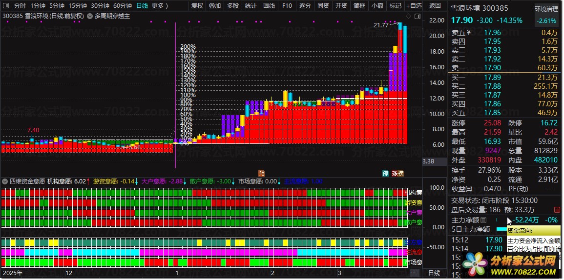 资金分层可视化:类似于“资金分层模型”,该图谱通过算法将交易资金拆解为主力、大户、中户、散户等不同层级。利用不同周期的成交量均线模拟各类资金行为,并以分层柱状图展示其相对活跃度,从而直观揭示“谁在买、谁在卖”,解决了传统指标中多空力量模糊的痛点。