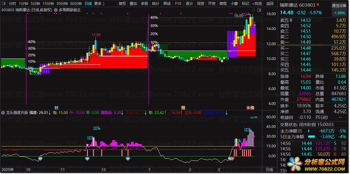 2. 通过多周期均线判断趋势强弱,结合主力线、散户线识别资金动向;