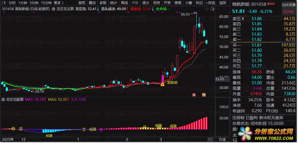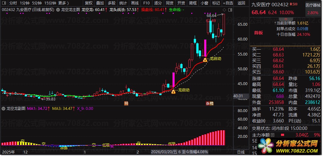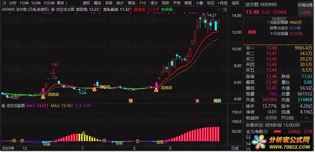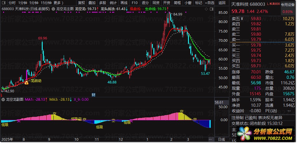 游资龙空龙信号:当出现红色图标及“---龙启动”文字时,代表个股经历充分调整(如“龙空”阶段)后,伴随放量阳线突破,是妖股突破或暴力拉升的起爆信号。