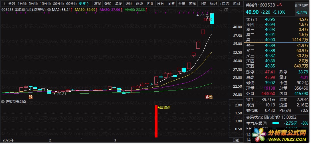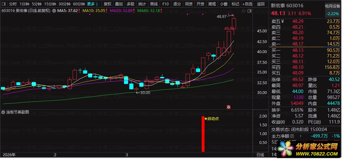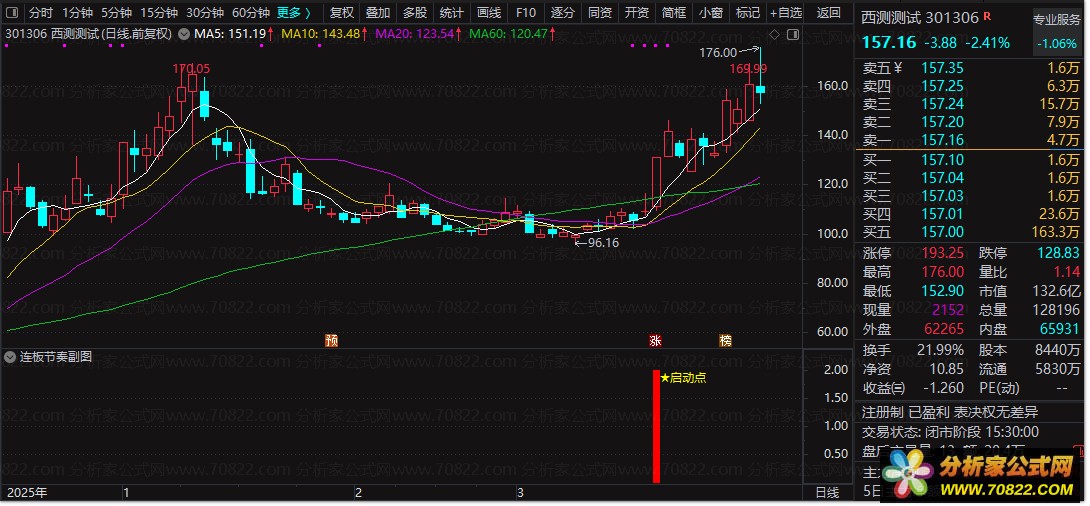 副图观察: 将副图公式加载到副图区。当出现红色柱状线并伴有青色“★启动点”文字时,表明个股进入加速上涨的连板节奏,是短线介入的积极信号。