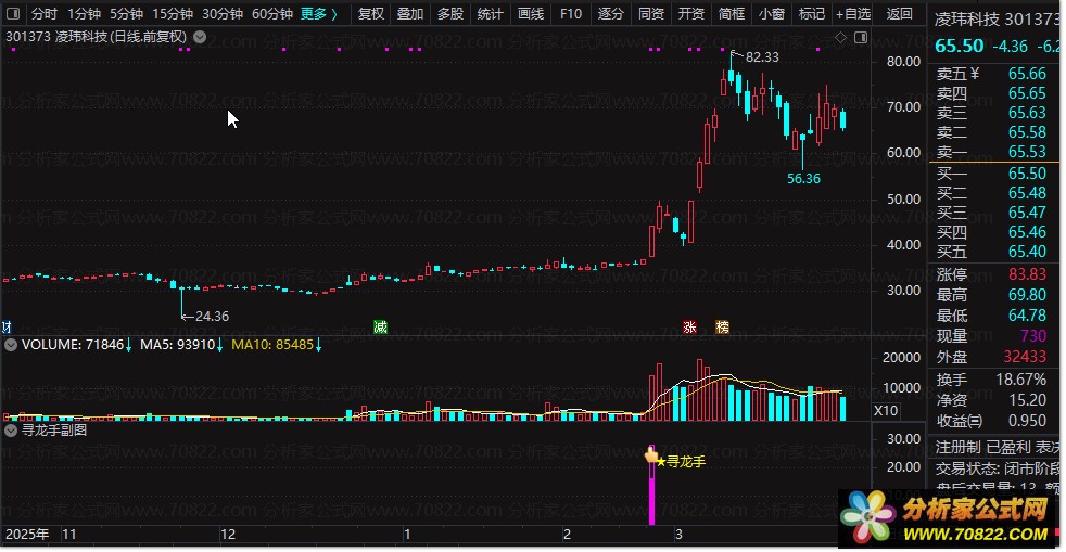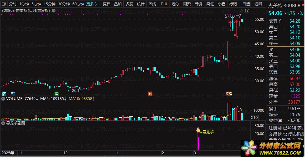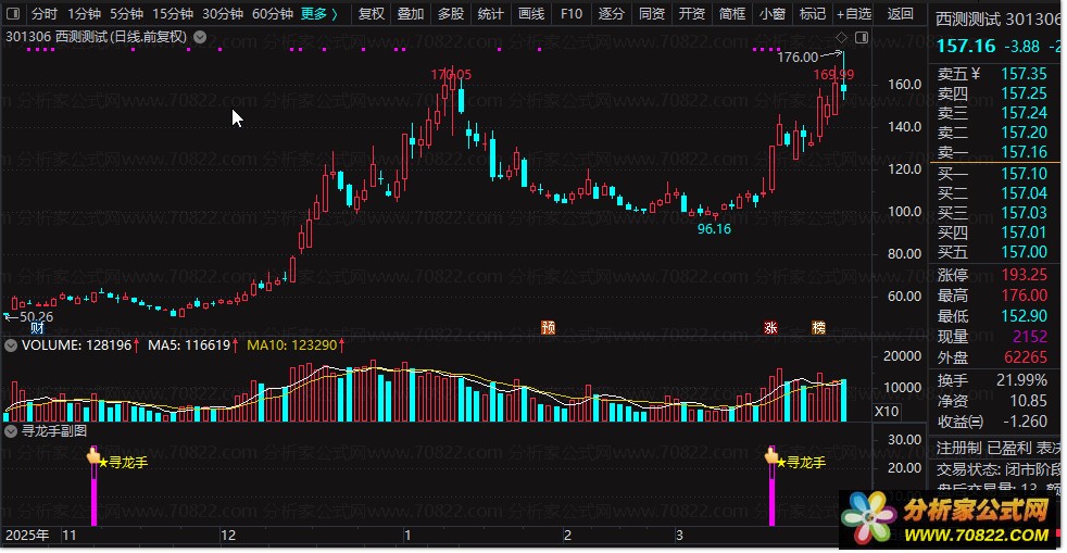 副图观察:将副图源码导入通达信。当图表中出现紫色柱状线并伴有“★寻龙手”字样及图标时,意味着主力资金已经开始异动,股价可能进入加速期。