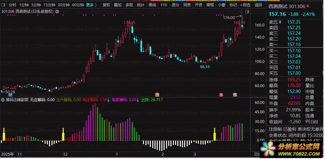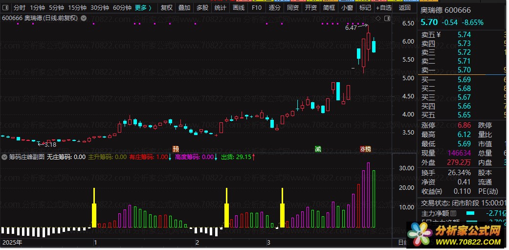 副图通过红、紫、绿、白四色柱状体,直观展示主力从“建仓(白色)”到“拉升(红色/紫色)”再到“出货(绿色)”的全过程。其中,紫色柱体代表“高度控盘”,是股价即将爆发的强烈信号。选股公式则精准锁定“筹码突破”的起爆点,即趋势由弱转强且获利盘比例达标的瞬间。