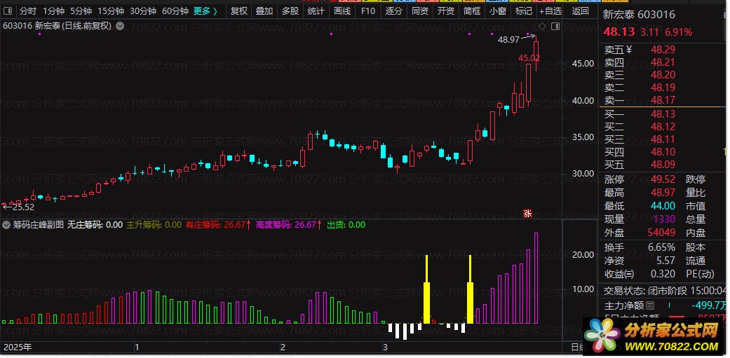 关注紫色柱体: 当副图中出现紫色柱体(高度筹码),意味着主力高度控盘且股价处于强势区,是持股待涨或激进介入的信号。