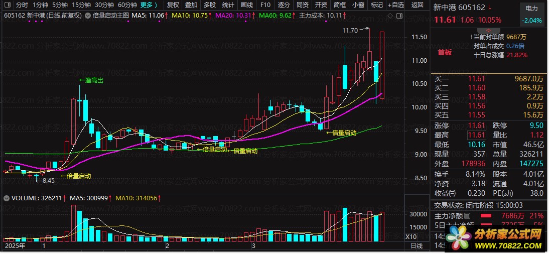 主图配合:将主图公式加载到K线图。当出现“←倍量启动”字样,且股价站稳在“主力成本”线之上,同时均线系统呈多头排列时,为较佳的介入时机。