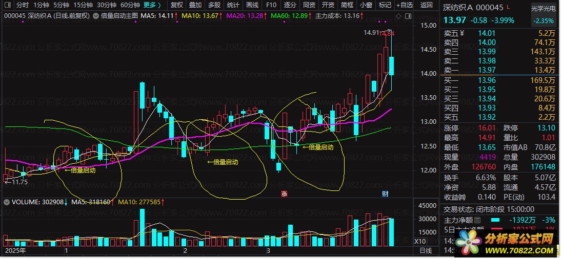 “←倍量启动”(蓝色):当短期EMA均线上穿长期EMA均线时触发,提示潜在的上涨爆发点,是核心关注信号。