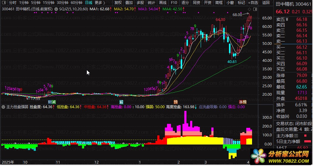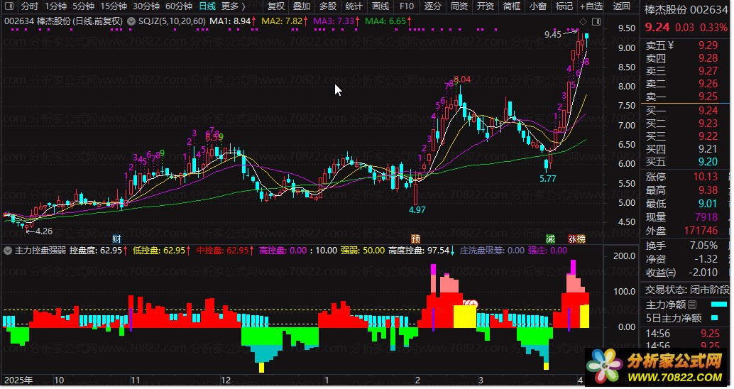 控盘度柱状图:黄色代表低控盘,红色代表中控盘,紫色代表高度控盘,让你一眼识别主力掌控力度。