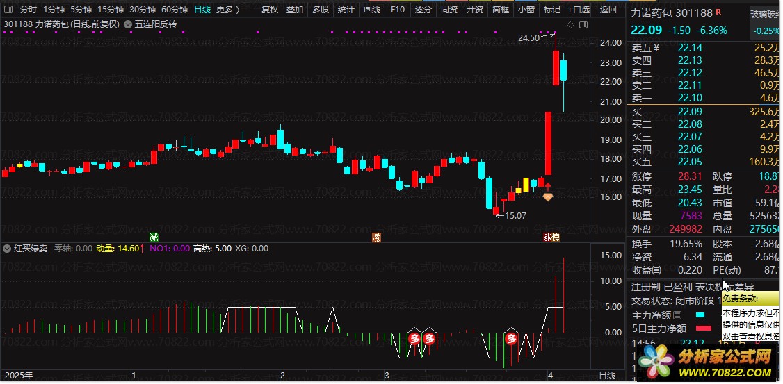 主图显示黄柱(连阳)、红柱(非连阳阳线)、青柱(阴线),配合底部红色箭头(反转信号)和黄色图标双重确认。操作时需注意:信号出现后需结合成交量放大、MACD金叉等指标验证,避免假突破。本指标适合中短线波段操作,尤其适用于震荡市中的趋势反转捕捉。