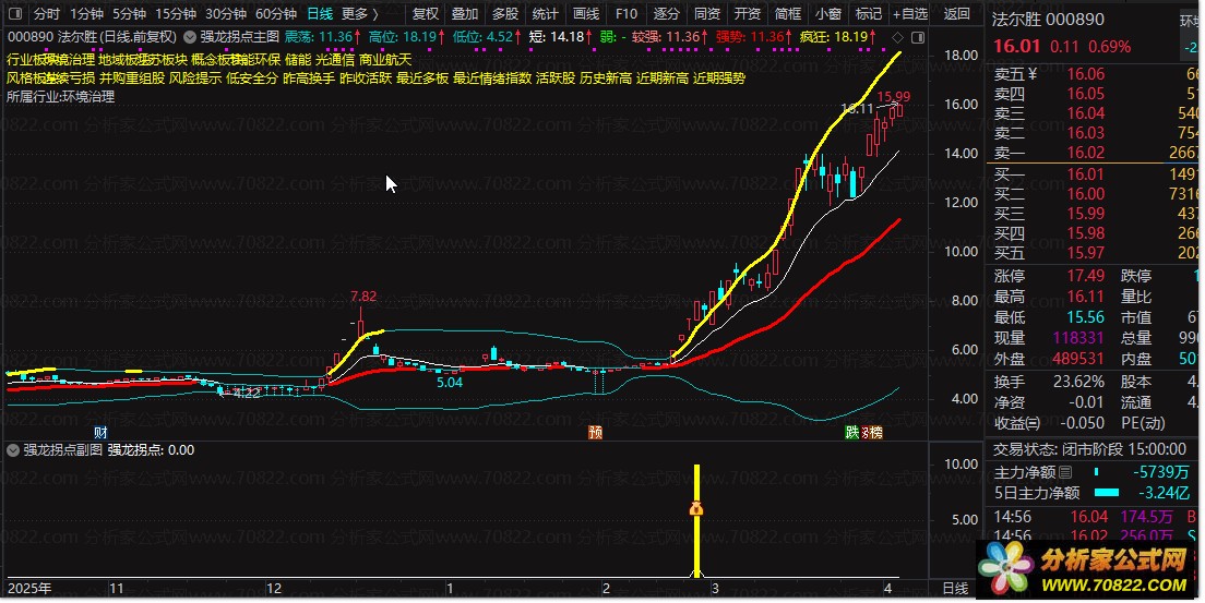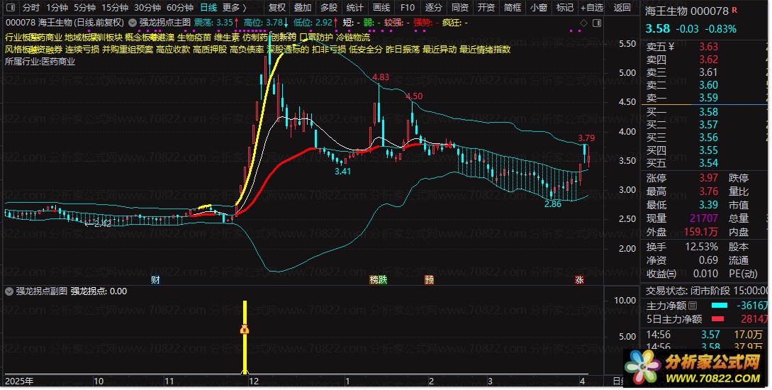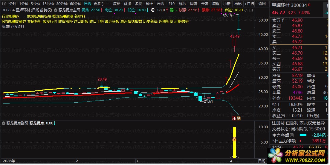 副图与选股:这是公式的精华。当个股出现连续5天收阳线,且紧接着出现涨停板时,副图会在底部发出黄色信号柱和图标提示。这通常意味着个股已经完成了蓄势,进入了加速上涨的“强龙”阶段。