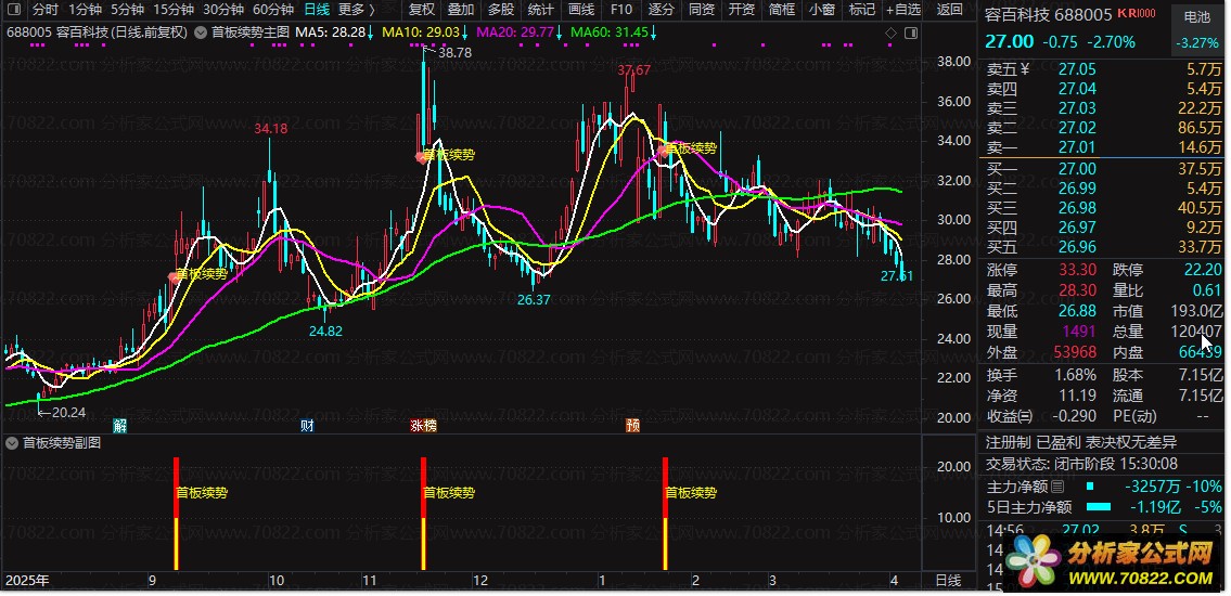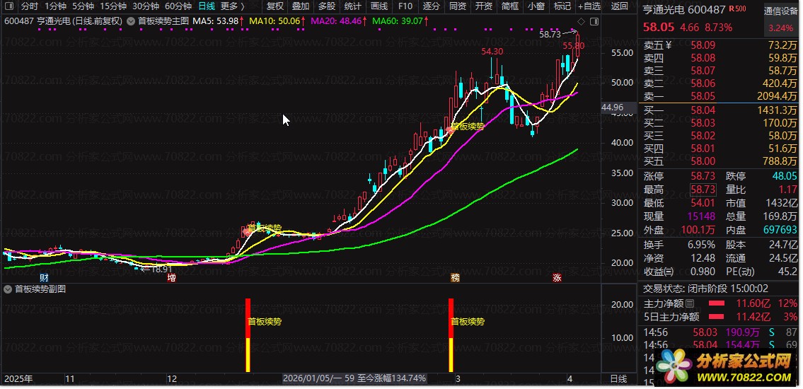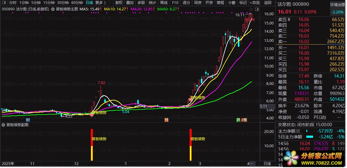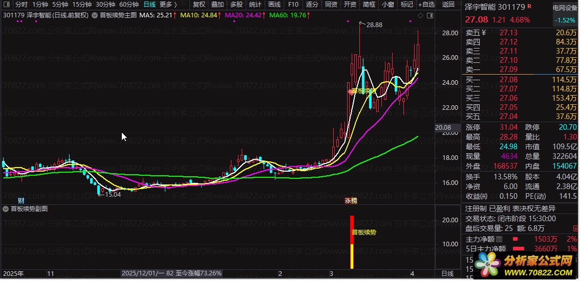 主图/副图:当出现“首板续势”文字或红色柱体时,表明该股具备连板潜力或趋势加速特征。建议结合MA5均线多头排列使用,成功率更高。