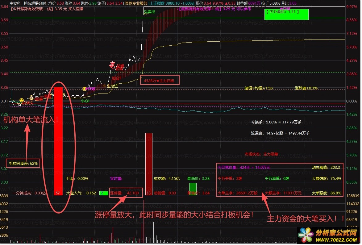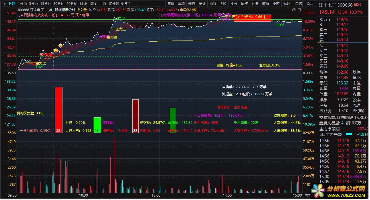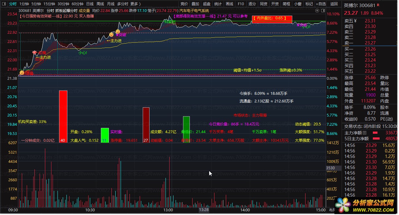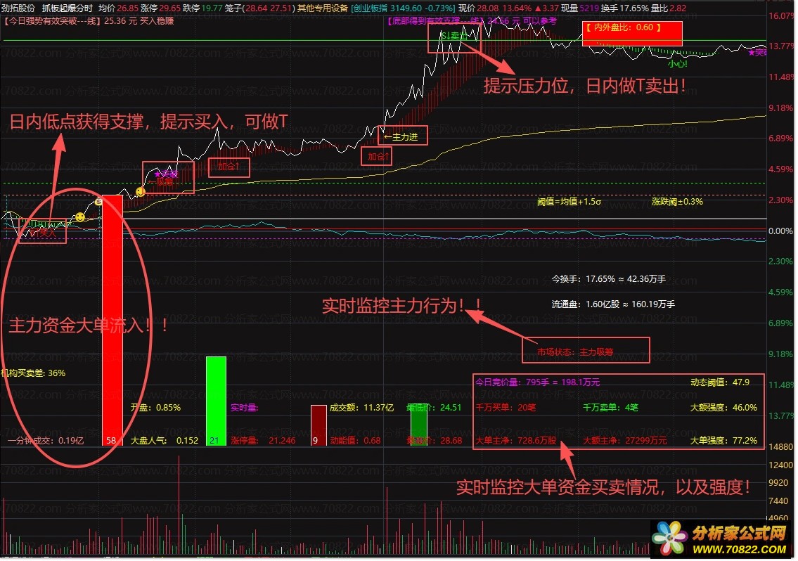 〖抓板起爆分时〗很牛叉的日内做T分时主图!值得拥有 一、超全面的分时主力资金监控 + 买卖点提示 + 市场状态判断复合型公式,整合了资金流向、量价分析、主力行为、阻力支撑、竞价数据、动态阈值六大核心逻辑,是实战型分时看盘公式。
