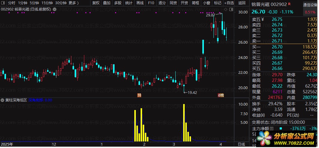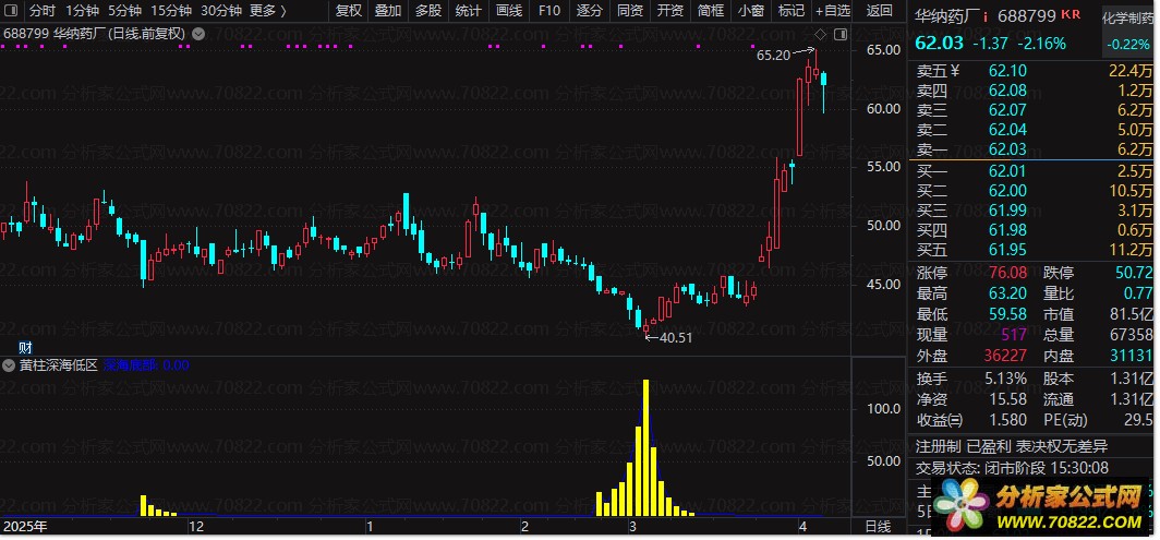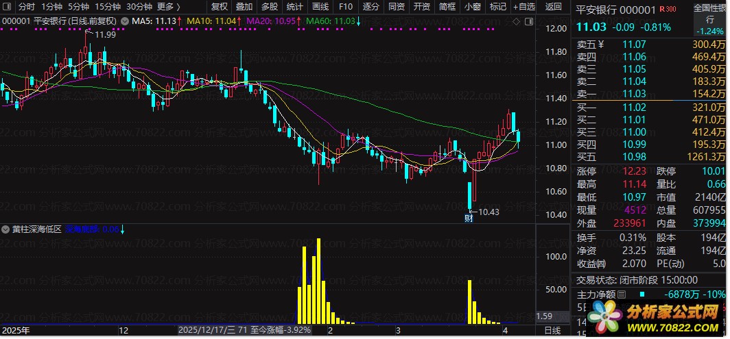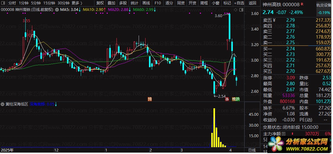 信号识别:当副图中出现黄色柱体时,表示股价已进入“深海底部”区域,是潜在的超跌反弹机会。
