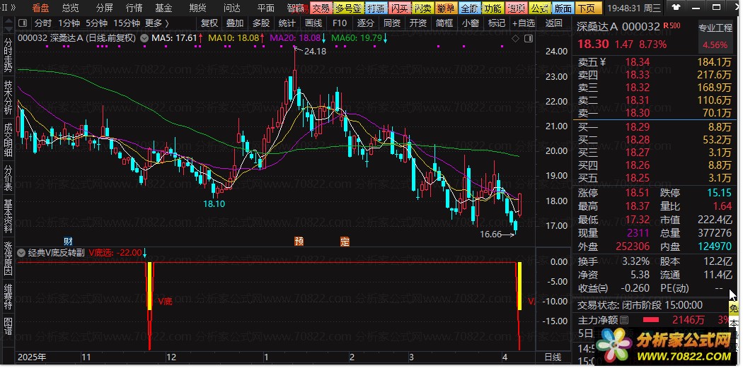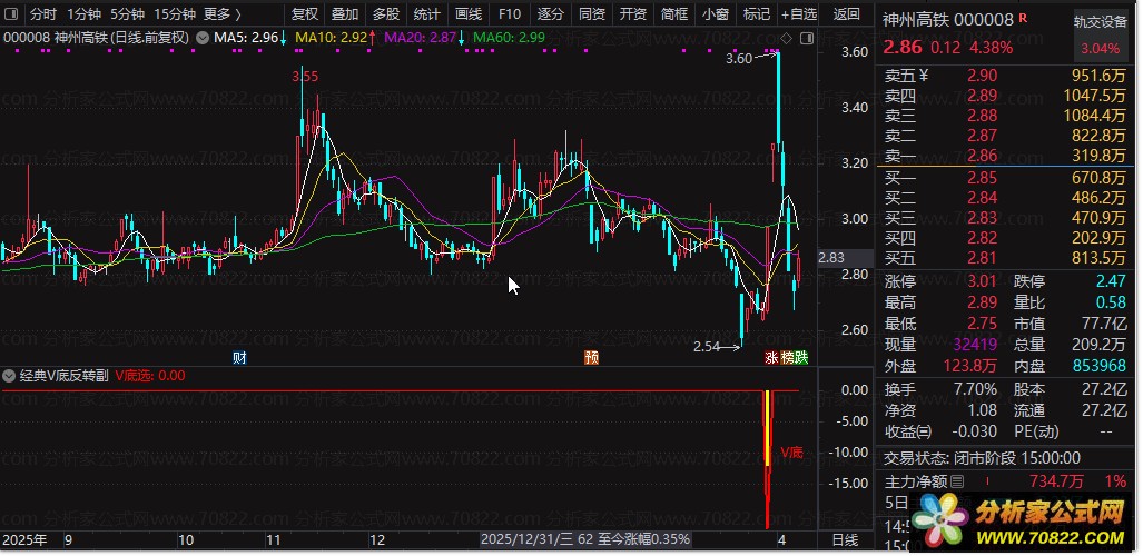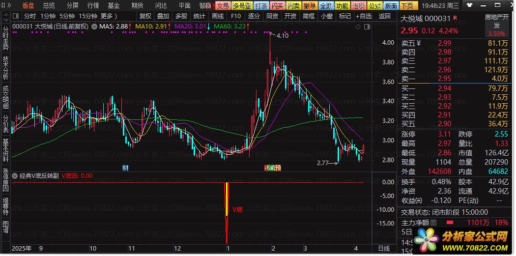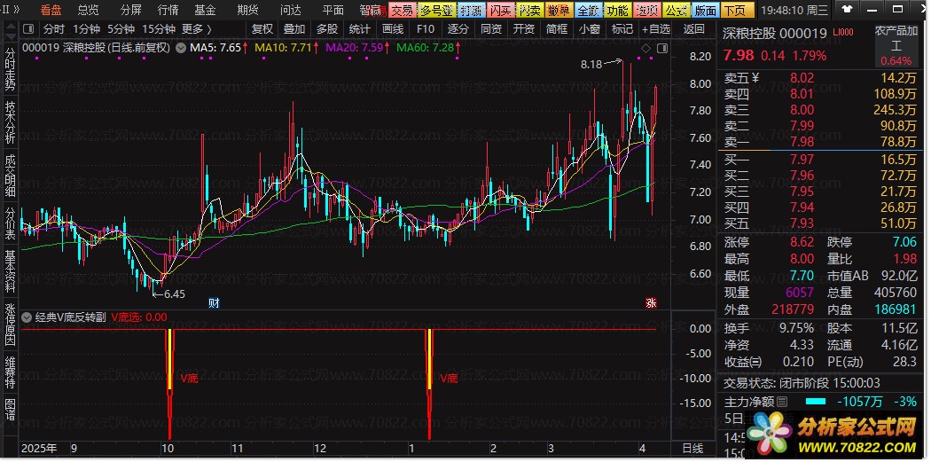 副图信号:当副图出现黄色柱状线并伴有红色“V底”文字提示时,即为关注信号。这代表股价可能已经探明阶段性底部,短期有反弹需求。
