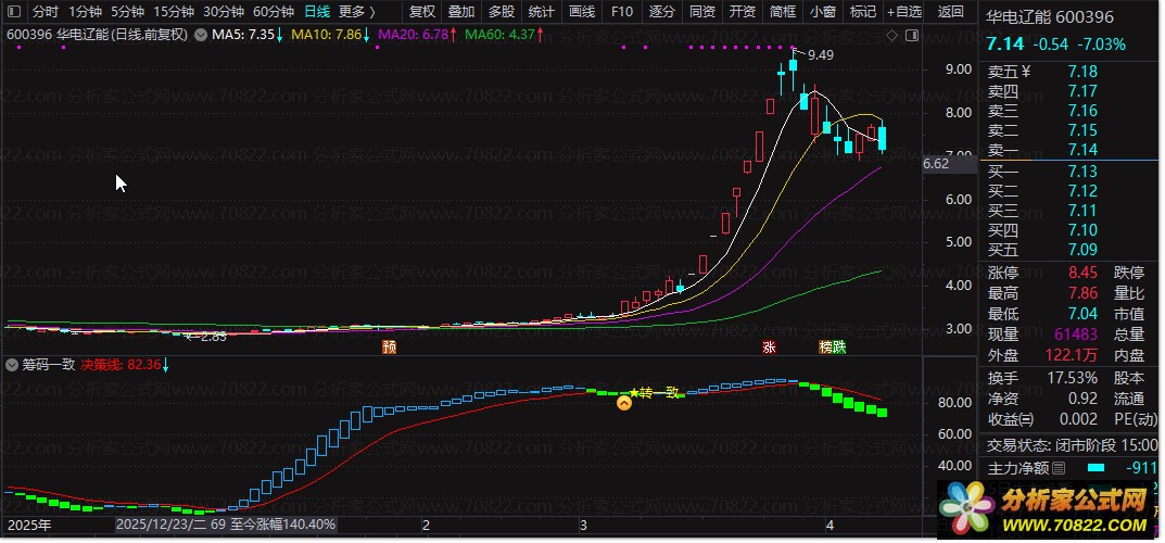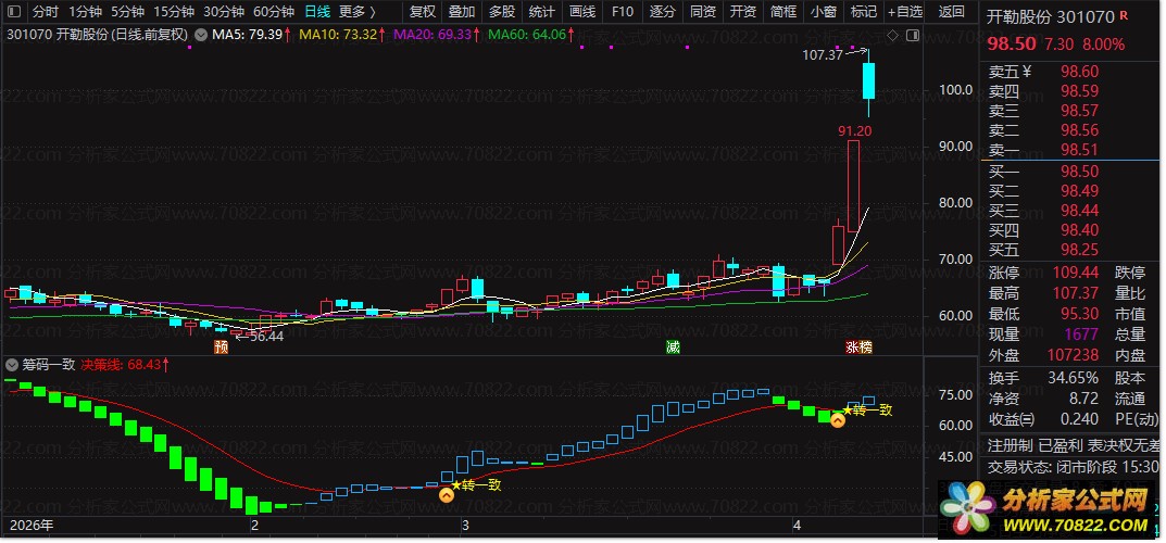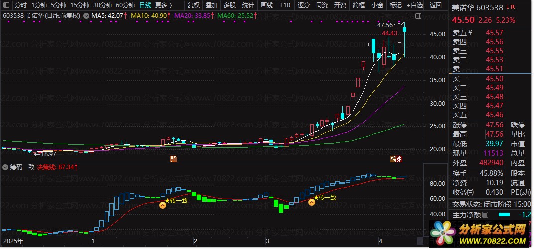 “★转一致”信号:这是指标的精华所在。当副图上出现“★转一致”的文字和图标时,意味着个股的筹码结构达到了高度一致,是趋势可能发生转折的重点关注信号。