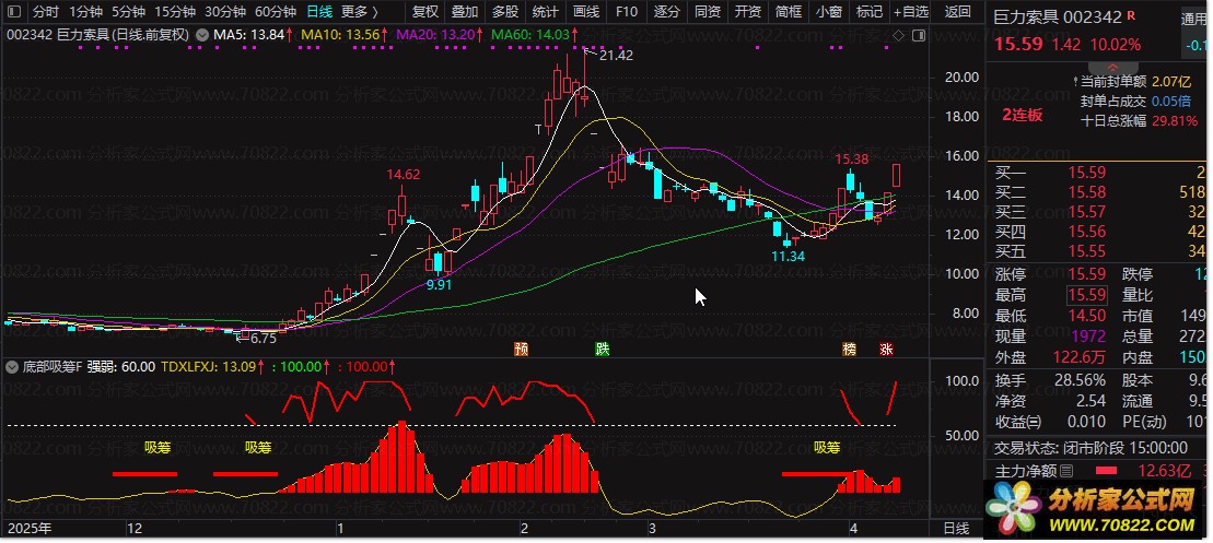 〖猎牛先锋〗副图/选股指标,精准捕捉主力二波启动信号 “猎牛先锋”是一款专为通达信设计的副图及选股指标,核心逻辑在于捕捉趋势向上过程中,主力资金回调后再次加速入场的“二波启动”信号。该指标通过复杂的数学模型,筛选出近期走势强劲、均线多头排列、缩量回调不破支撑,且主力资金再次大举拉升的个股,旨在提升选股效率。