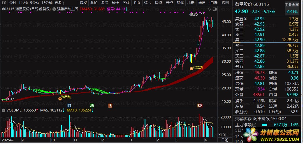 主图配合:在K线图上加载主图指标。当股价位于红色EMA60上方,且出现黄色K线+“※启动”信号时,是极佳的右侧介入点。