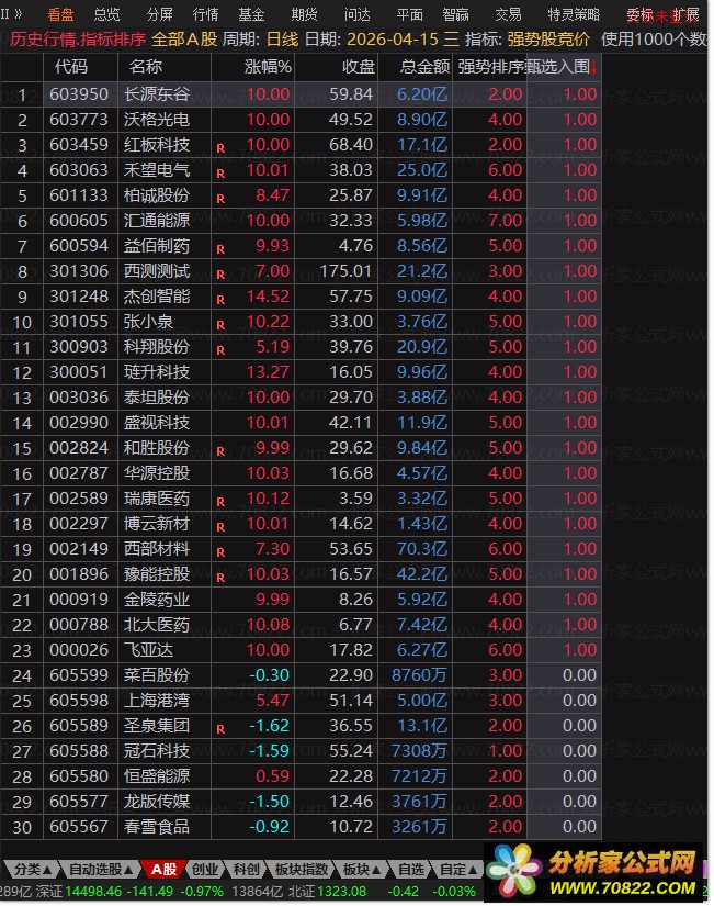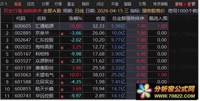 〖强势股竞价排序〗买来的金钻指标,波动+跳跃+热度+筹码+过滤+去新+昨涨 本指标是买来的别人的金钻指标,分享给大家。