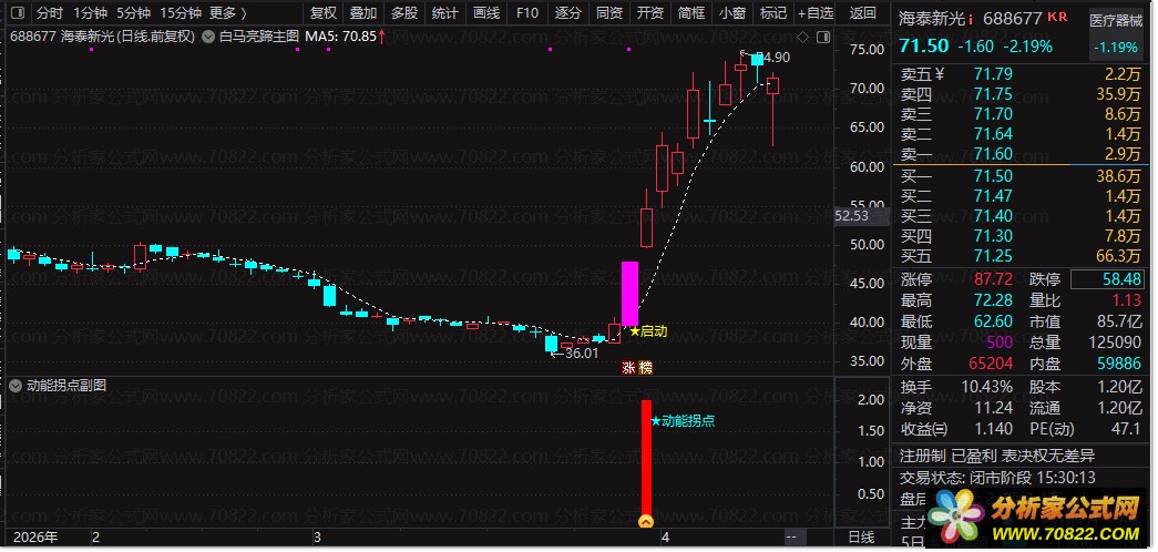 副图观察:当出现红色柱+黄色“★动能拐点”文字+图标时,代表短期超卖修复与中期趋势向上的共振买点;